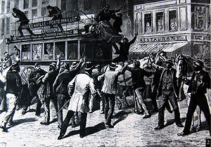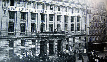 - 1er mai 1886 : à peu près 200 000 travailleurs se mettent en grève pour obtenir la journée de huit heures. À Chicago, les ouvriers se rassemblèrent à l'usine Mc Cormick pour revendiquer la journée de huit heures de travail quotidien, pour laquelle une grève générale mobilisant 340 000 travailleurs avait été lancée. Deux jours plus tard, les policiers tuèrent deux grévistes[19] ce qui déclencha des émeutes qui firent plusieurs morts. Sept policiers furent tués par l'explosion d'une bombe (Massacre de Haymarket Square). Quatre anarchistes furent exécutés en 1887[20], [21]. Le 1er mai servit de référence à la IIe Internationale pour la fête des travailleurs.